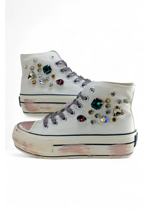 Yüksek bilekli tasarımı ve beyaz keten kumaşıyla trend bir görünüm sunan genç kız ayakkabısı.