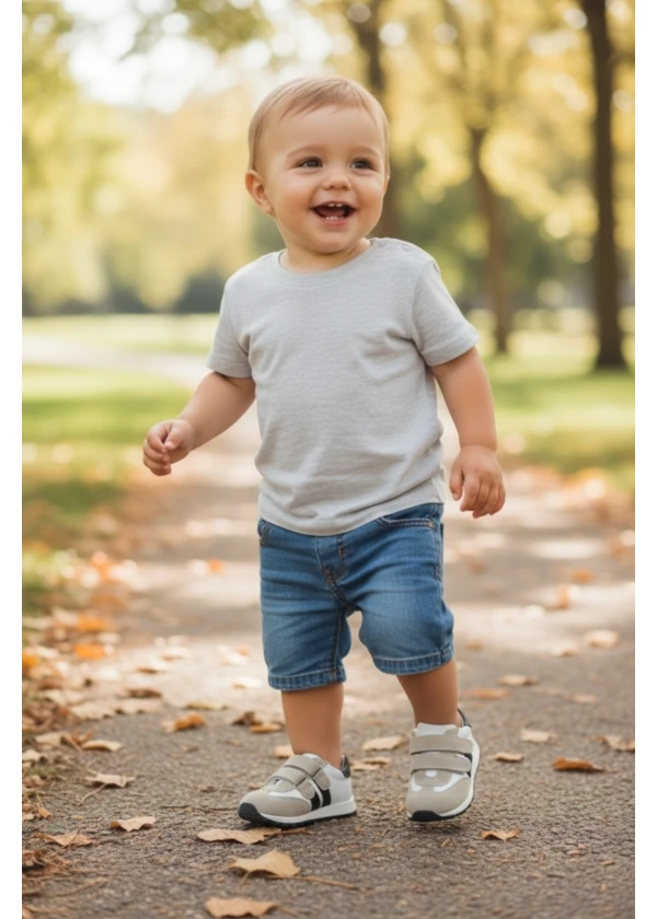 Beyaz rengi ve çizgili detaylarıyla şık, cırtlı tasarımıyla pratik bebek ayakkabısı.