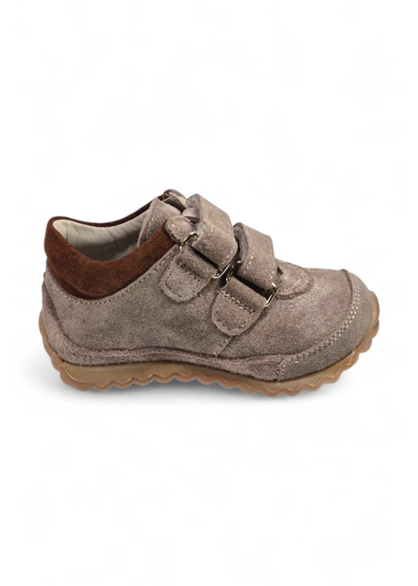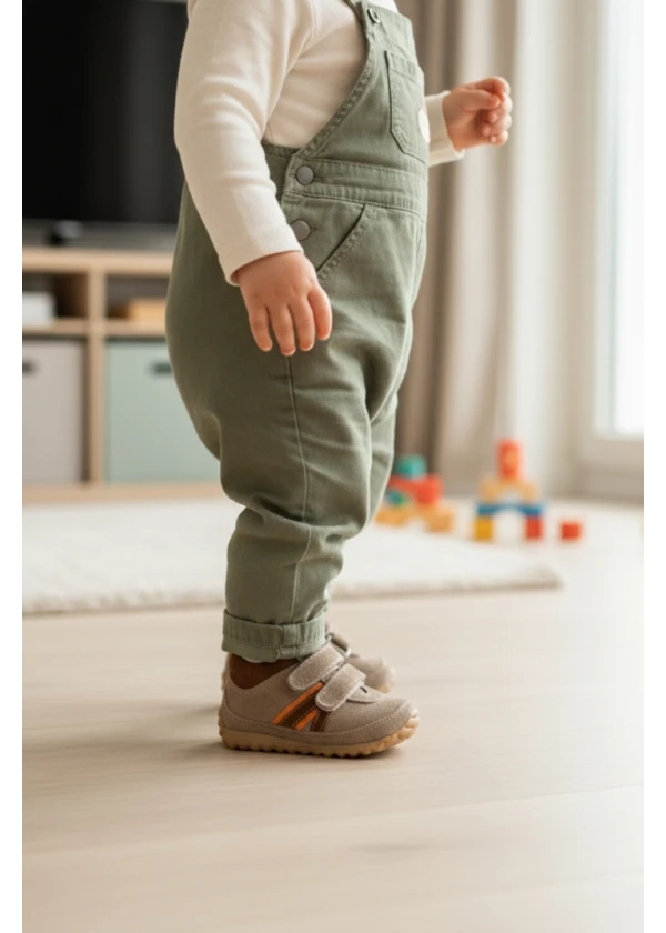Sıcak kahverengi tonu ve Perlina kalitesiyle üretilen ortopedik bebek spor ayakkabısı.