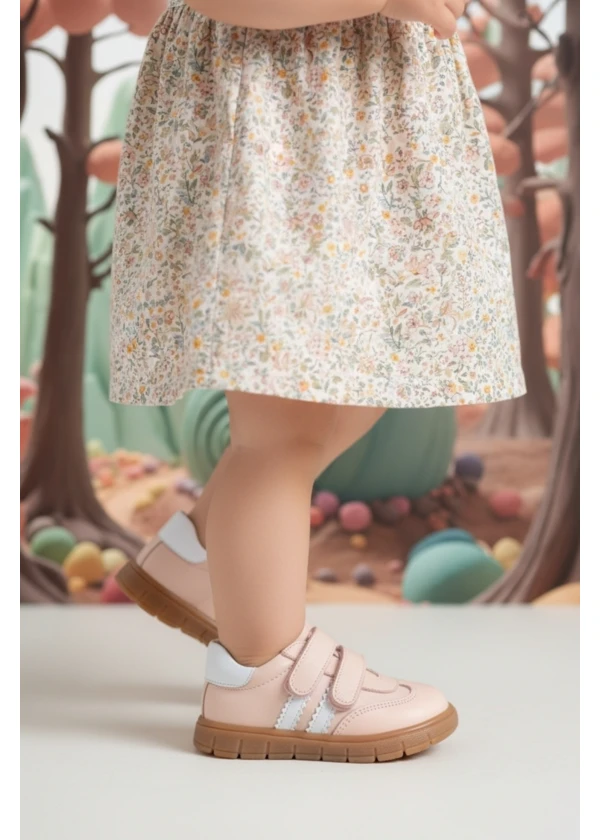 Pudra Hakiki Deri Tam Ortopedik Çizgili Bebek Ayakkabısı